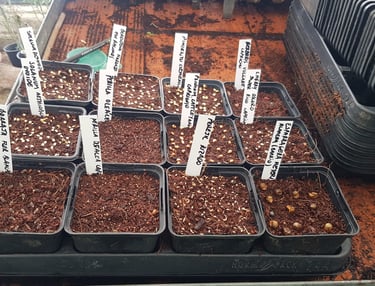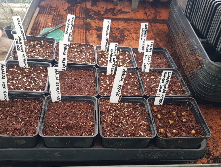 Reproducción de plantas por semilla, esquejes, división de mata e injertos. Tenemos nuestro propio banco de semillas autóctonas y adaptadas al medio ambiente.
